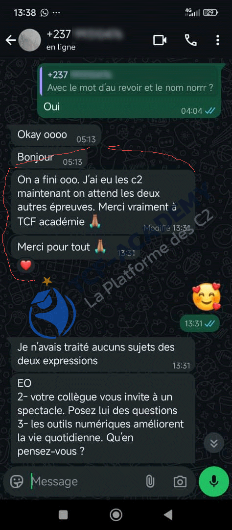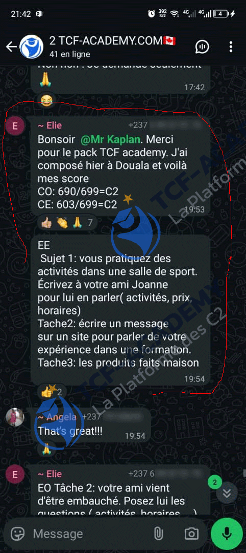 🇨🇦 Canada“ Je cherchais une plateforme qui m'aiderait à me préparer efficacement pour le TCF Canada, et TCF-ACADEMY a dépassé mes attentes. Les sujets d'expression écrite et orale constamment mis à jour m'ont permis de rester aligné sur les dernières tendances de l'examen. Les simulations avec les formateurs experts m'ont donné la confiance nécessaire pour exceller le jour J. Un grand merci à toute l'équipe ! ”